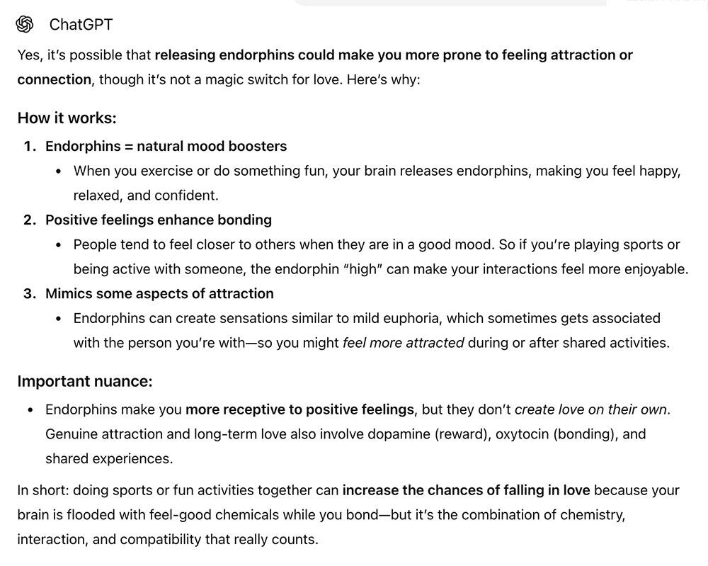 P.S. Doing sports releases endorphins. That is a proven fact. So we asked ChatGPT "Could releasing endorphins make you fall in love more easily?"Here is the answer: